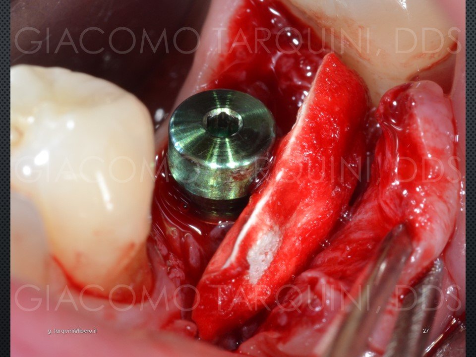 membrane riassorbibili ma con prolungato tempo di protezione può rappresentare un fattore di successo in grado di aumentare significativamente la predicibilità della terapia rigenerativa. Nel caso clinico presentato, la scelta della membrana barriera è caduta su una Flex Cortical Sheet che, a differenza delle tradizionali membrane in collagene, è rimodellata per via osteoclastica: questo consente la sua degradazione in un periodo di tempo considerevolmente piu' lungo. La gestione dei tessuti molli peri-implantari è stata realizzata mediante il ricorso a una matrice collagenica tridimensionale come alternativa al tradizionale innesto di tessuto connettivo autologo prelevato dal palato.