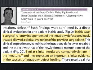 Introduzione: Non è molto comune valutare l'esito di una procedura di GTR (Rigenerazione Tessutale Guidata) poiché, a differenza delle procedure di GBR (Rigenerazione Ossea Guidata), i denti trattati solitamente non necessitano di essere scoperti. Solo raramente, per svariati motivi, viene eseguita una procedura di rientro chirurgico; in tali occasioni è possibile valutare l'entità della rigenerazione tessutale. Il presente caso clinico mostra un rientro chirurgico occasionale, effettuato a distanza di 3 anni dall'intervento iniziale di GTR per ragioni mucogengivali. Abbiamo colto questa opportunità per esaminare visivamente la quantità e la qualità del tessuto parodontale rigenerato dopo tre anni. ConclusionI: L'uso combinato di una membrana barriera in pericardio associata a un innesto osseo eterologo ha permesso un trattamento rigenerativo sicuro ed efficace di difetti infraossei profondi. La terapia rigenerativa (GTR) ha dimostrato di essere efficace anche nel lungo periodo. PER ULTERIORI INFORMAZIONI: CLICK HERE PER INFO E ISCRIZIONI: CLICK HERE-